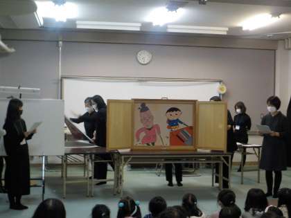 チョボラーズの皆さんが子どもたちに向けて大型紙芝居の読み聞かせをしてくれています。