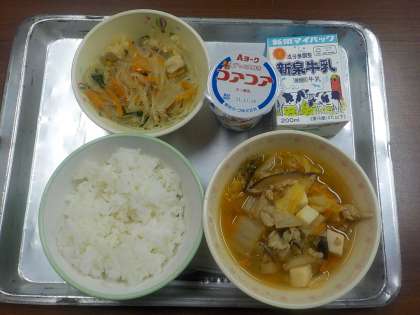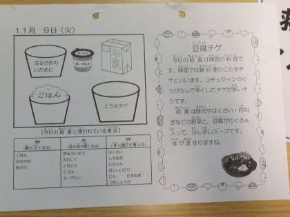 今日の献立はごはん,牛乳,豆腐チゲ,春雨の炒め煮,ヨーグルトでした。韓国では鍋料理のことをチゲというそうです。