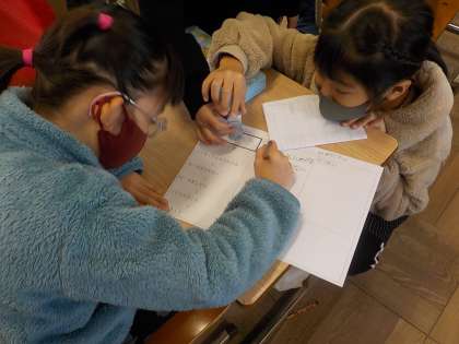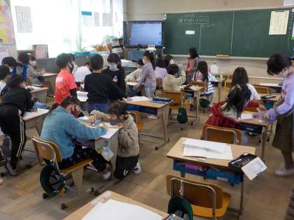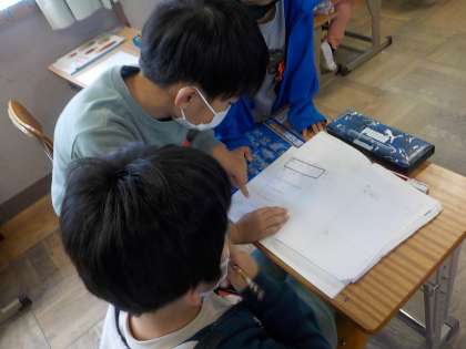 算数で繰り下がりのある引き算の学習をしています。間違った解き方を見てどこか違うのかを伝え合っています。