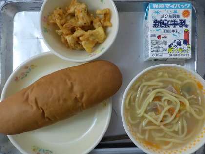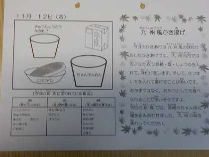 今日の献立はこくとうパン,牛乳,ちゃんぽん麺,九州風かきあげでした。九州風かきあげはさつまいもを入れて砂糖,塩,しょうゆをつけて味付けをするそうです。