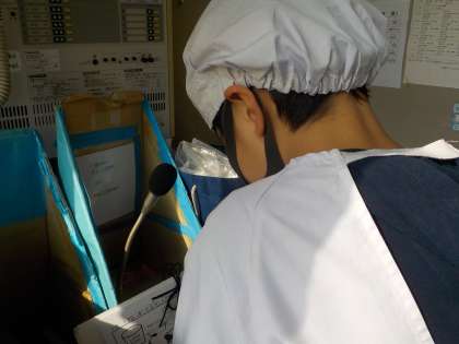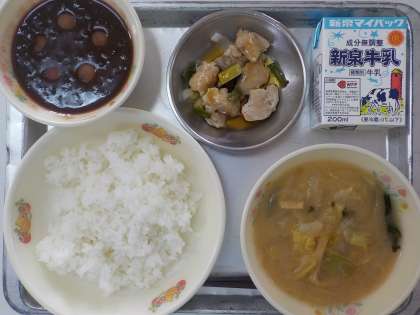 今日の献立はごはん,牛乳,みそ汁,焼き鳥丼,白玉ぜんざいでした。