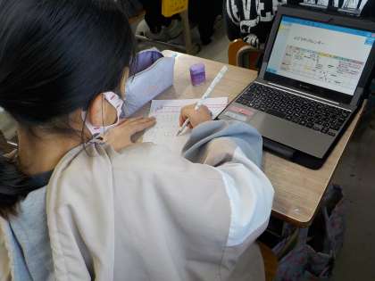 社会でぶどう栽培のカレンダーを見て気付いたことをノートに書いています。