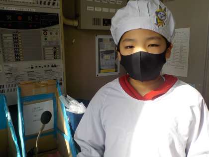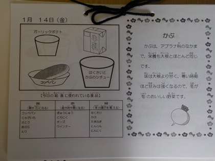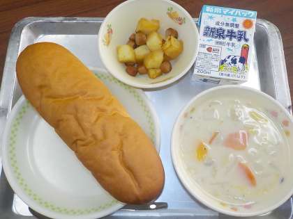 今日の献立はコッペパン,牛乳,白菜とかぶのシチュー,ガーリックポテトでした。