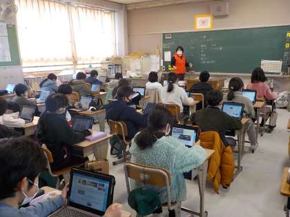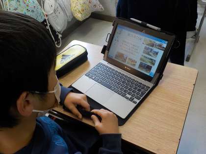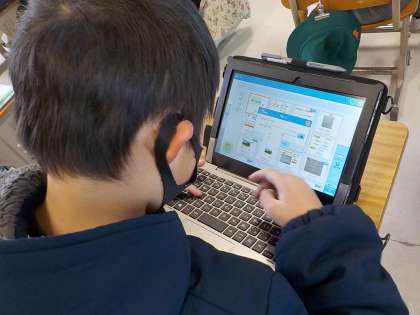 町探検で調べた内容についてコンピュータを使ってまとめています。
