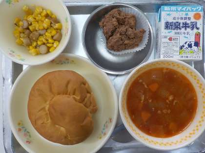 今日の献立はソフトパン,牛乳,ミネストローネ,ウインナーコーン,おからチョコケーキでした。