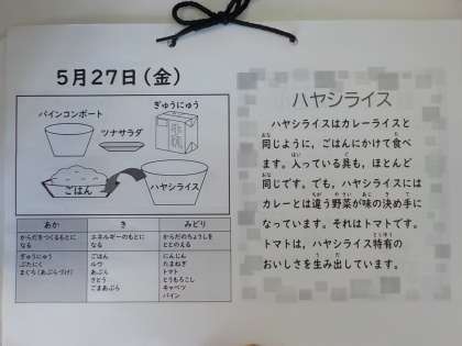 今日の献立は,ハヤシライス,ツナサラダ,ごはん,牛乳,パインコンポートでした。
