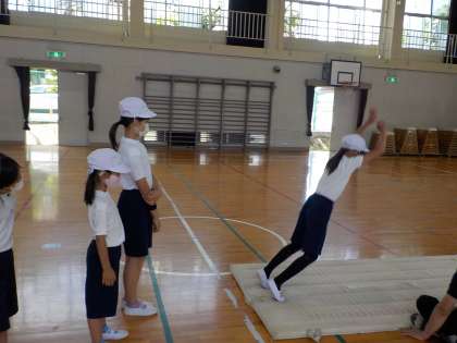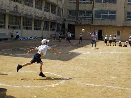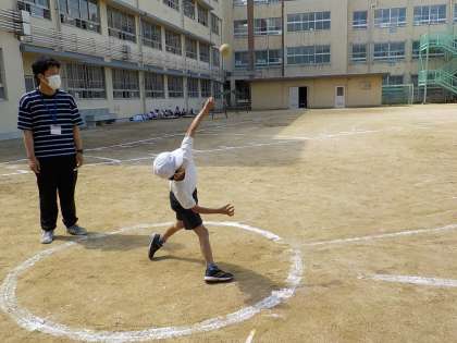 今日はスポーツテストに取り組んでいます。ソフトボール投げと立ち幅跳びに取り組んでいます。