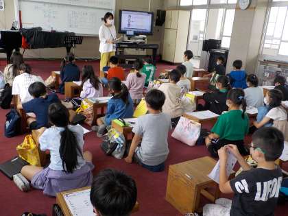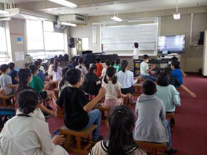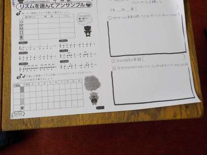 音楽で「リズムを選んでアンサンブル」の練習中です。