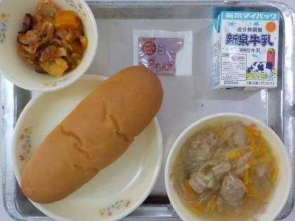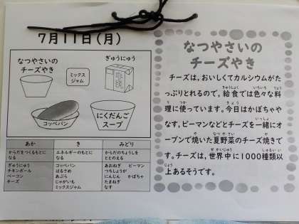 今日の献立は,コッペパン,牛乳,肉団子スープ,夏野菜のチーズ焼き,ミックスジャムでした。