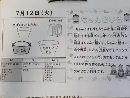今日の献立は,ごはん,牛乳,ちゃんこ汁,サバのおろしだれでした。