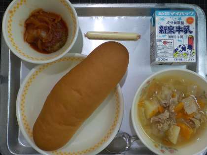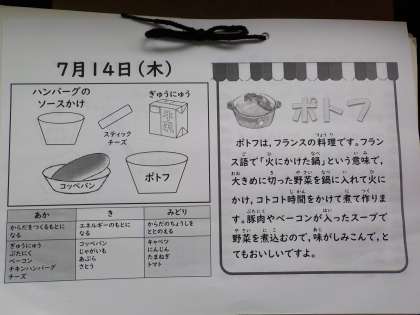 今日の献立は,コッペパン,牛乳,ポトフ,ハンバーグのソースがけ,スティックチーズでした。ポトフとはフランス語で「火にかけた鍋」というそうです。