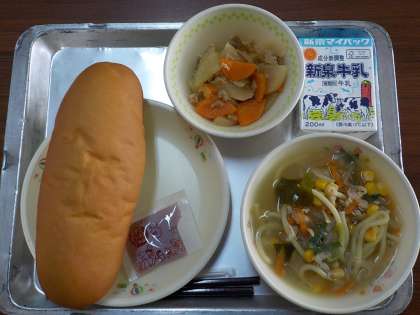 給食の献立は,コッペパン,牛乳,わかめラーメン,大根のベーコン煮,ミックスジャムでした。