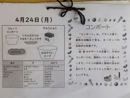 今日の献立は、春野菜スープ、ツナとポテトのマヨネーズ風やき、フルーツコンポート、牛乳でした。