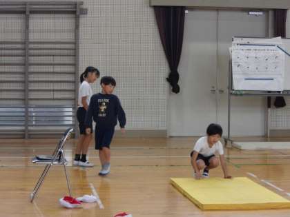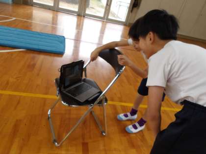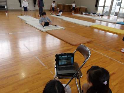 体育でマット運動をしています。追っかけ再生機能を使って自分の演技の様子を確認しています。