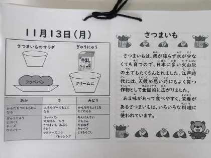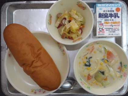 今日の献立は、クリーム煮、コッペパン、さつまいものサラダ、牛乳でした。