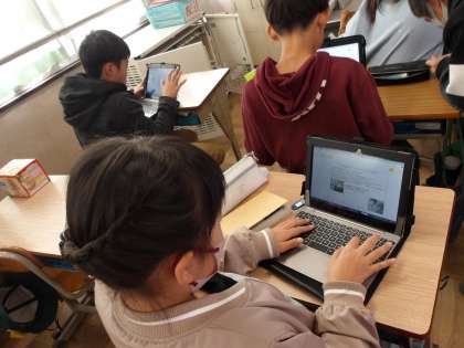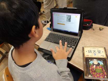国語の学習でタブレットを使って、本の紹介文を作成しています。