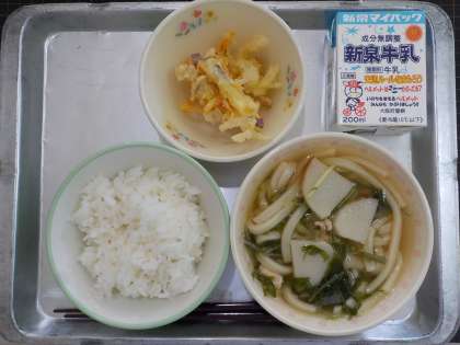 今日の献立は、とりなんばんうどん、ごはん、かきあげ、牛乳でした。