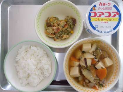 今日の献立は、のりしおチヂミ、豆腐チゲ、ごはん、のむヨーグルトでした。