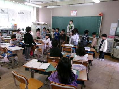 「たし算とひき算」という内容で,列に並んだ子どもの人数の合計を考えていました。自分は前から〇番目で,自分より後ろは〇人いるという問題で,実際に並んだり数えたりしながら考えていきました。