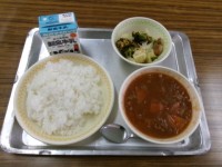 今日の給食は、ごはん、牛乳、飛鳥鍋、豚肉のしょうが焼きでした。