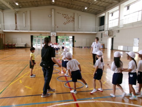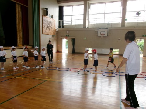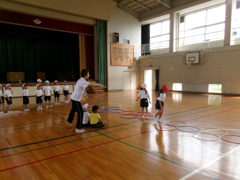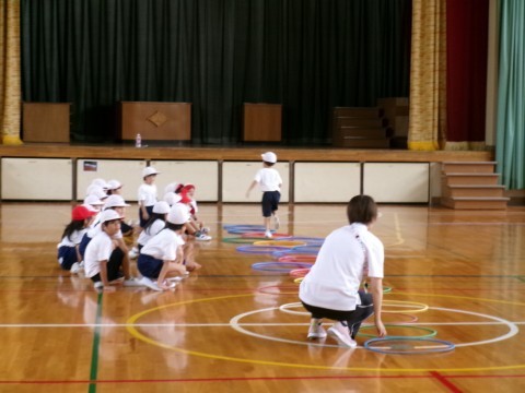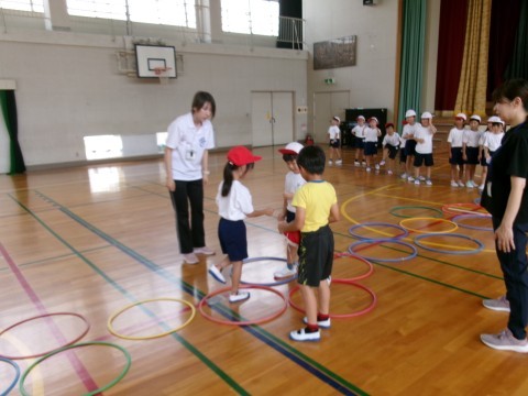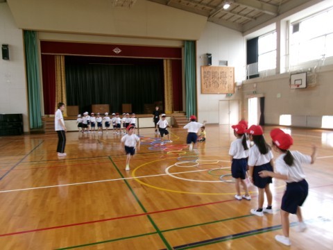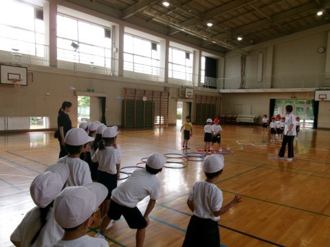2つのチームに分かれて,一人ずつフープを片足,両足で跳びながら前に進んでいきます。出会ったところでじゃんけんをして,勝ったら先に進み,負けたら自分のチームの最後に並んで次の人が進んでいくというゲームをしていました。みんな楽しく身体を動かすことができました!