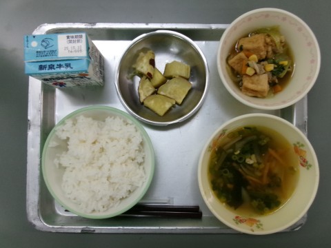 今日のメニューは,ごはん,わかめスープ,厚揚げの中華煮,焼き大学いも