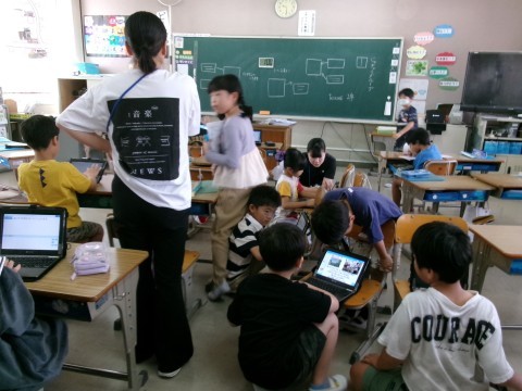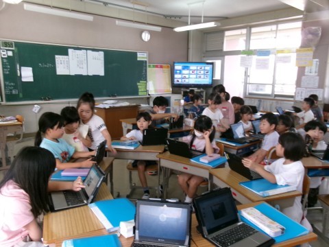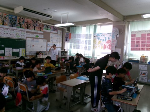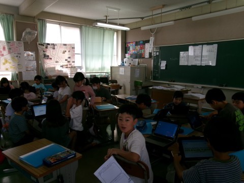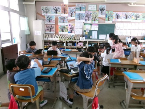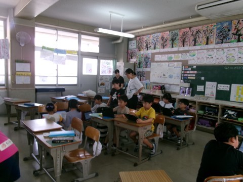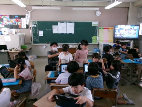 どちらのクラスも,「町たんけん」で見学したり説明したりしていただいたお店などについて,タブレットでまとめていました。同じお店を訪問したグループごとにまとめたものを,みんなに発表していく予定です。