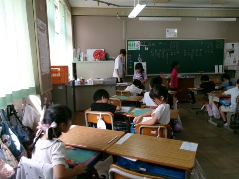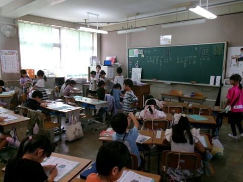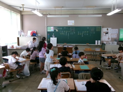 新出漢字の練習をしていました。今日は「田」と「川」です。みんな一生懸命練習していました。練習が終わった子から,先生に確認してもらっています。
