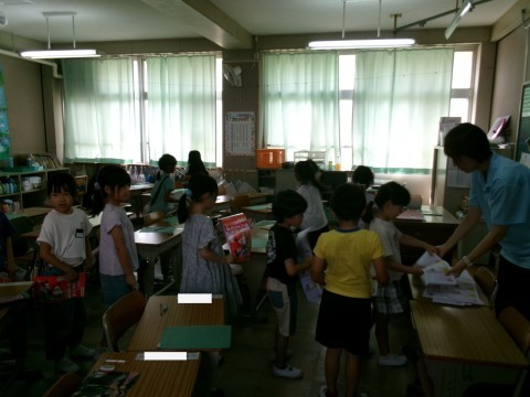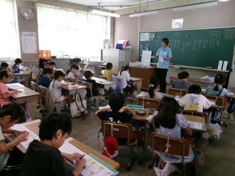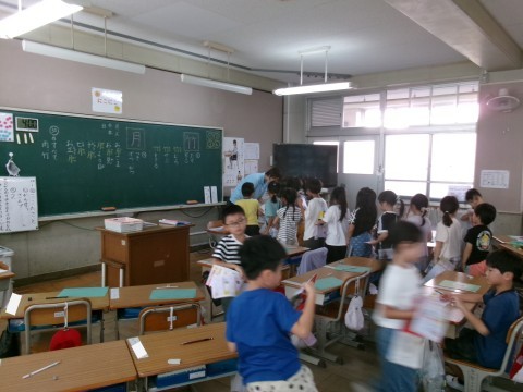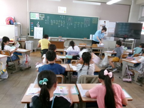新出漢字の練習をしていました。今日の漢字は「竹」と「月」です。練習が終わった子から,ドリルを前に出して配り物の手伝いをしてくれていました。