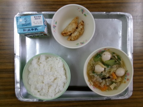 今日のメニューは,ごはん,八宝菜,あげギョーザでした。