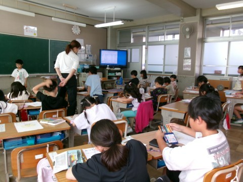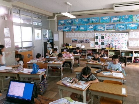 今日は中秋の名月です。そこで,子どもたちはお月見の絵を描いていました。月の中に見えるイメージを自分で考えて描いています。一人ひとりがいろいろな絵を描いていました!