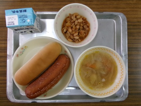 今日のメニューは,ミニパン,揚げパン,うずら卵入り野菜スープ,チリコンカンでした。