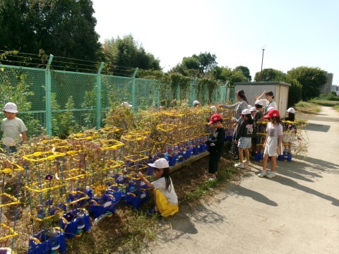 アサガオの植木鉢を移動したり水やり用のペットボトルを確認したりしていました。ひっくり返すと大変なので,慎重に運んでいます。