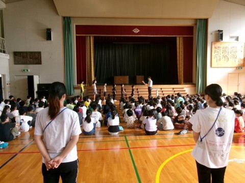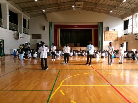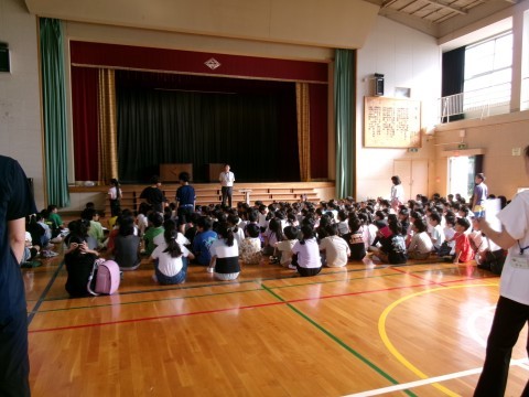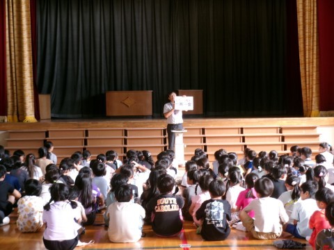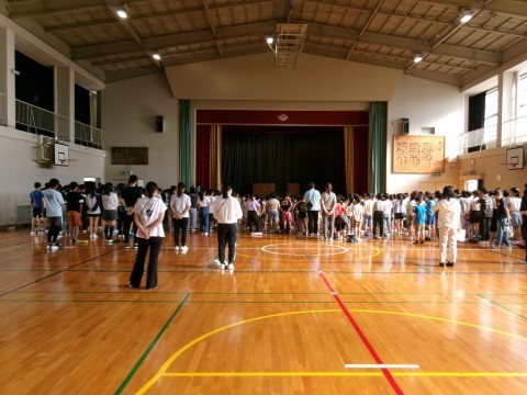 今日は月初めの火曜日なので,体育館で全校朝会を行いました。いつものように校歌を歌った後,先生たち全員とあいさつです。その後,理科展の表彰を行いました。