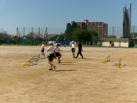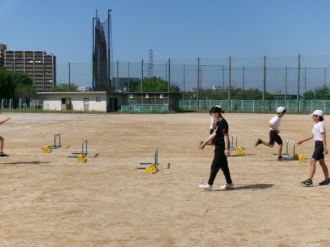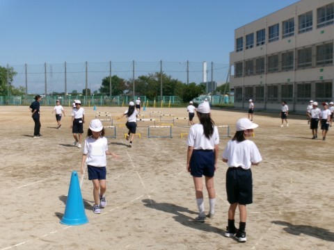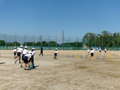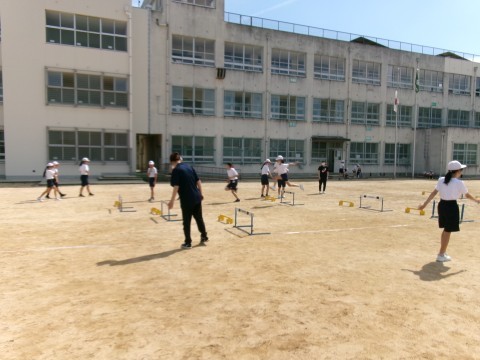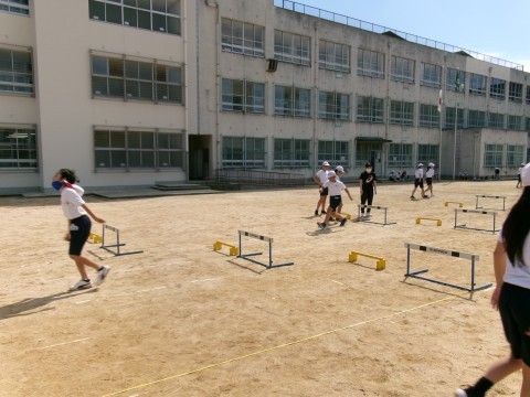 「ハードル走」の練習をしていました。通常のハードルだけでなく,高さが低いハードルやハードルの中心が割れて開くようなハードルを使って,間隔も何種類か選べるようにしながら,リズムよく跳び越える練習をしていました。