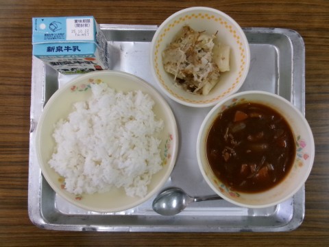 今日のメニューは,ごはん,ハヤシライス,えのきベーコンでした。