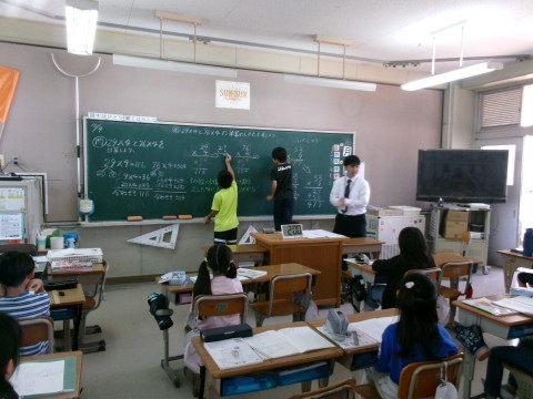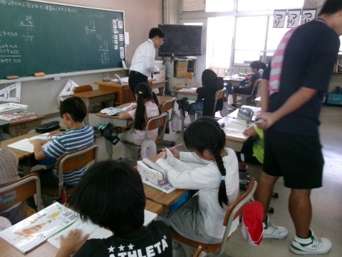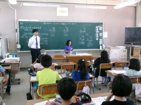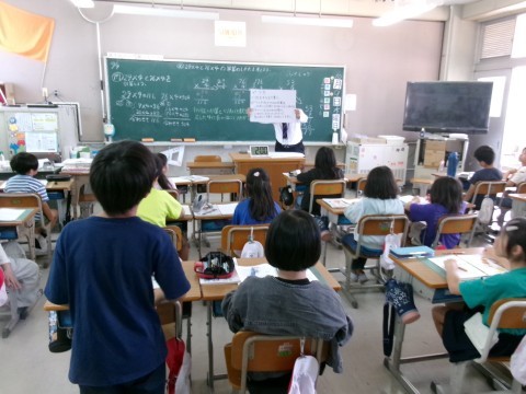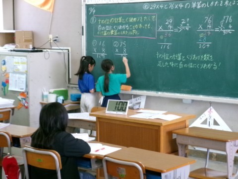 今日は,教育実習生の授業研究を行いました。十の位をたすと百の位に繰り上がるかけ算の筆算の計算の仕方を考えていきます。さくらんぼ計算を使って,一の位と十の位の計算に分けて2桁×1桁の筆算を行った後,29×4のように十の位が3と8(実際は30と80)になった時の筆算の操作を考えていきます。みんな一生懸命取り組んでいました。