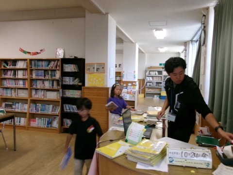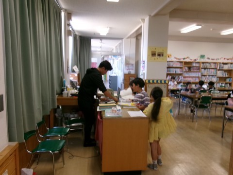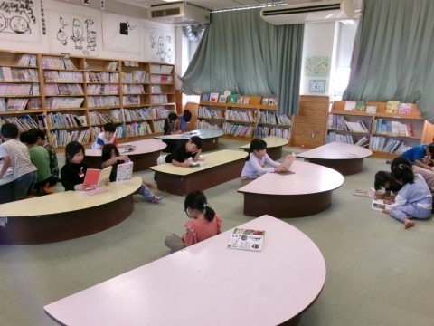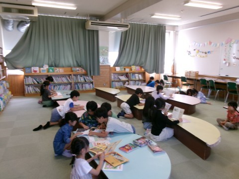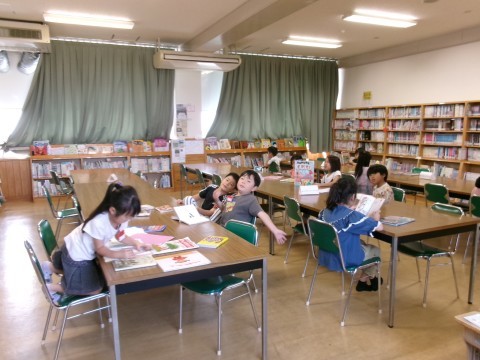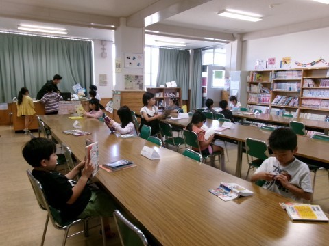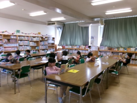 学年合同での図書の時間の様子です。みんな静かに読書をしています。気に入った本を借りる子もいました。