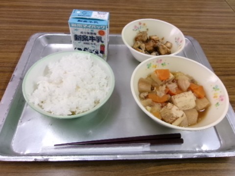 今日のメニューは,ごはん,すき焼き風煮,さばのごまみそ焼きでした。