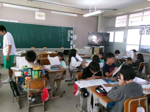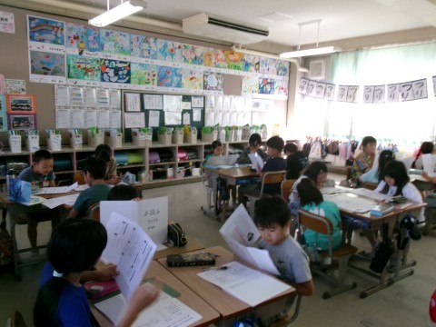「話し合いの進め方をたしかめよう」というめあてで学習を進めていました。まずは班ごとに,話し合いの進め方のプリントを読み合っています。