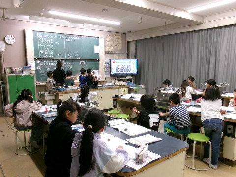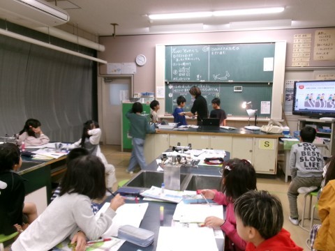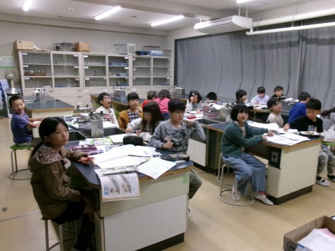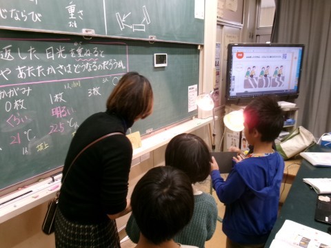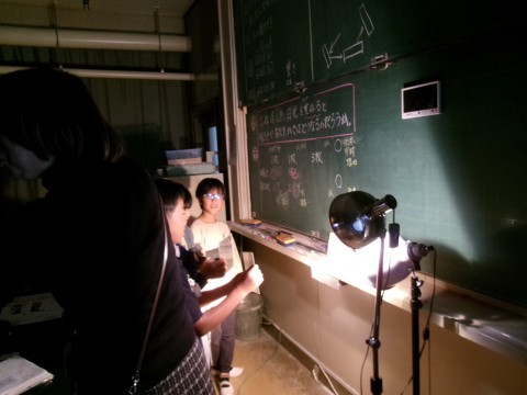 鏡にはね返された光を重ねると,明るさや温度はどうなるかを実験していました。今日は天気が悪かったので,ランプを太陽に見立てて実験しています。