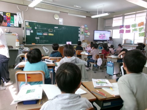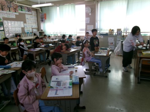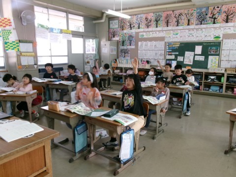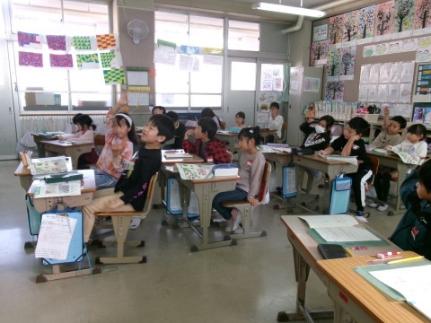 「かけ算のしきに書こう」というめあてで学習を進めていました。今回は,遊園地のコーヒーカップに同じ人数ずつ乗っているのではなく,4人や3人,2人などの人数で乗っている時の全部の人数を求める問題です。4人乗っているカップから1人抜いて,2人のカップに入れて考えると,カップの人数がすべて3人にそろうので,かけ算で答えを求められることに気づくことができました。