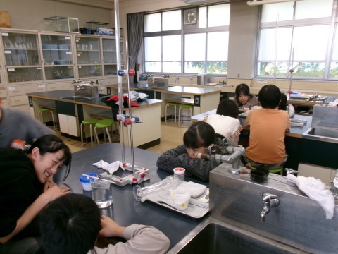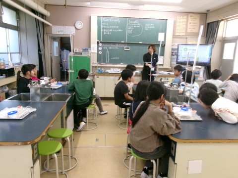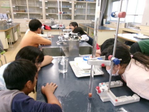 もののとけ方の観察をしていました。細長いガラス管を使って,塩がどのように溶けていくか観察しています。その後,さらに分かりやすくするために,簡易フィルターを使ったコーヒーの粉を溶かすように,塩をたっぷり入れたフィルターを水をたくさん入れたビーカーにつけて,溶けていく様子を観察しました。塩が水に溶けていく様子を見て,「クラゲみたい」「溶ける様子がはっきり分かる」などの感想を言っていました。