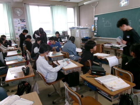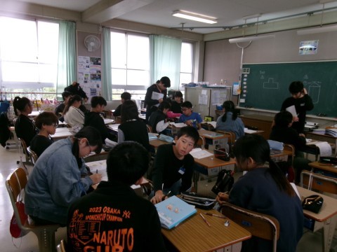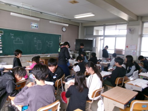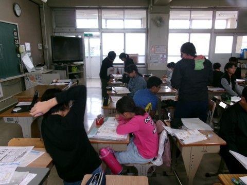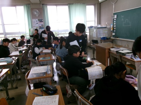 立体図形の体積の求め方の復習をしていました。友だちと一緒に考えたり,自分だけで考えたりしながら,問題に挑戦しています。