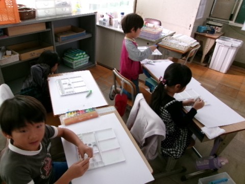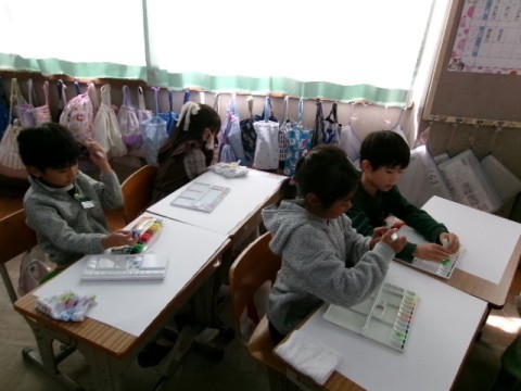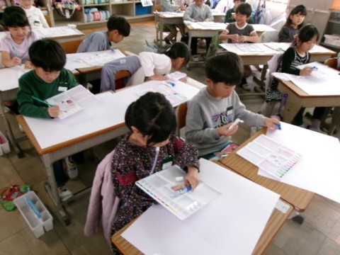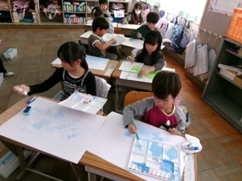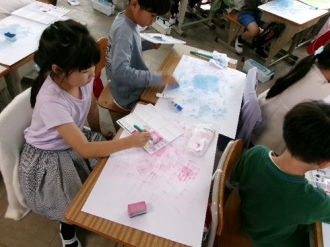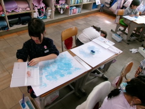 読書感想画を描いていました。ぞうの話なのですが,ぞうはべつに作って貼っていくので,今日は背景を描いています。薄い水色かピンク,黄緑色などいろいろな色で背景を塗っていました。