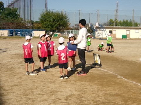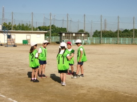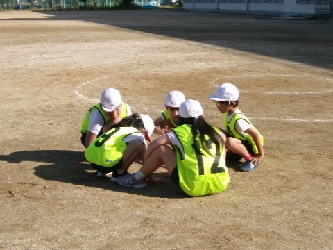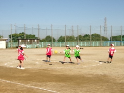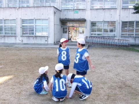 サークルシュートゲームをしていました。やり方にも慣れてきて,チームごとに作戦を考え,すき間を見つけて真ん中の子に上手にボールをパスすることができるようになってきています。