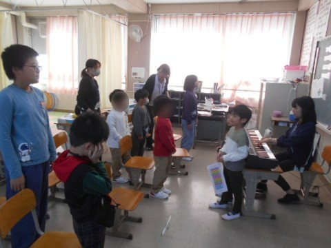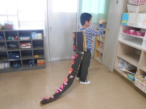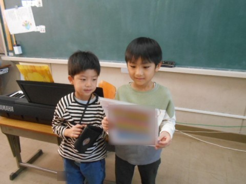 チャレンジタイムでは,みんなが交替で日直をします。この日の担当は,1年生です。日直カードを見ながら,友だちの名前を呼んでくれました。カップスの練習もとても上手です。小道具作りも進んでいます。何のしっぽかな?