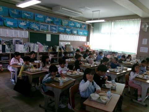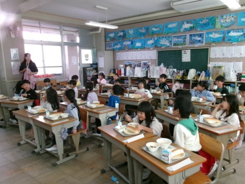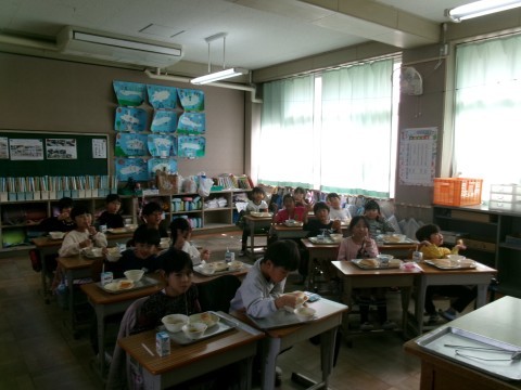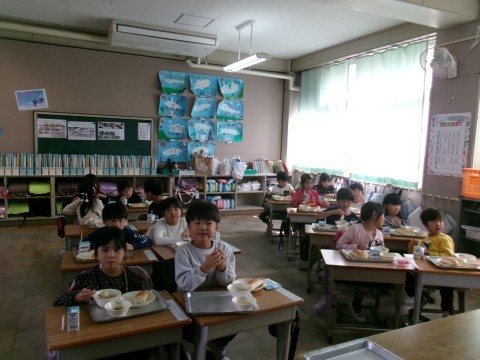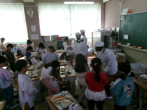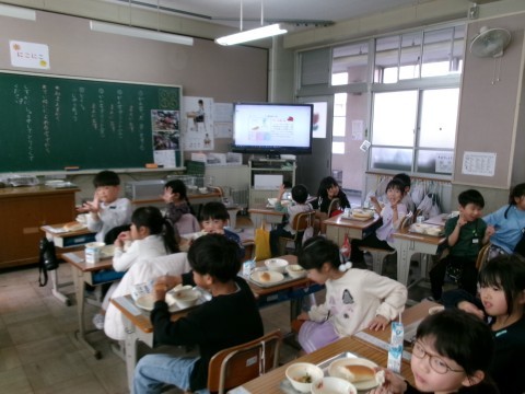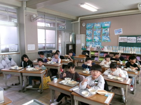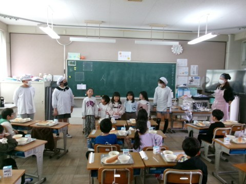 給食の時間の様子です。エプロンをきちんとたためたかどうか,6年生に見てもらったり,上手にたためた子をほめてもらったりしていました。どちらのクラスも,元気に給食を食べていました!