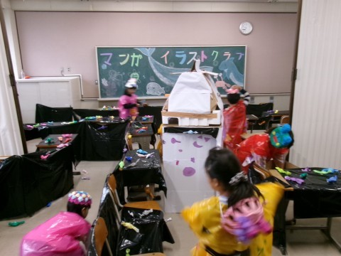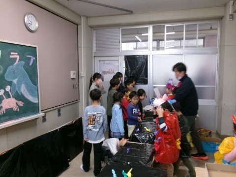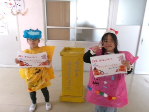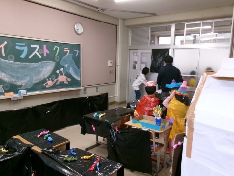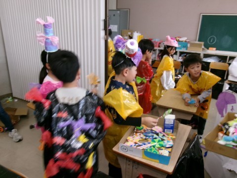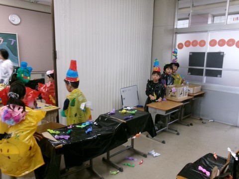 2年生のお店の様子です。みんな一生懸命準備して,お客さんをもてなしていました。前回のハロウィンパーティーの衣装を着て,呼び込みもしていました。