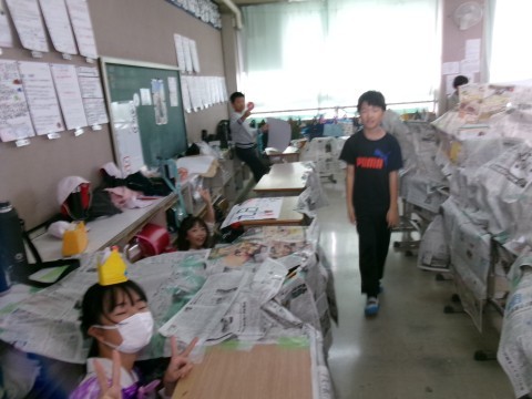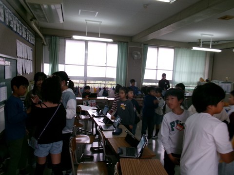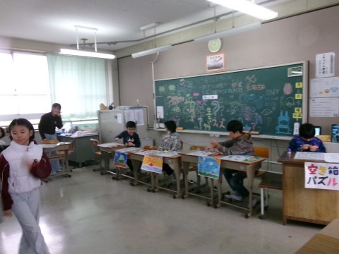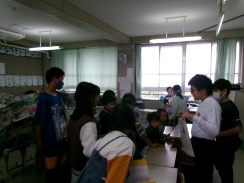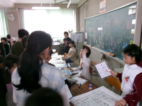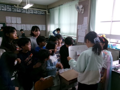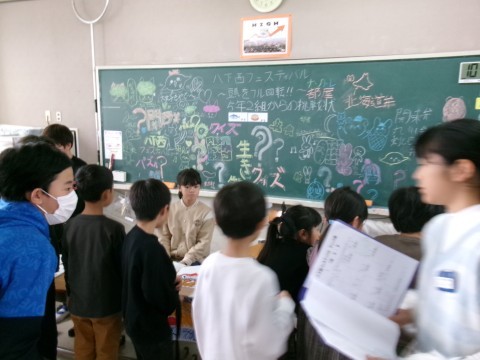 漢字や方言など,国語で学習した内容のクイズなどをしていました。他の学年もそうですが,低学年向け,中学年向け,高学年向けの問題を作って,みんなが活躍できるように配慮しています。それぞれのコーナーで正解すると,賞品がもらえます。その商品がすべて集まると,最後はハンバーガーになるなど,社会の学習にも関わらせながらクイズ全体を考えていました。